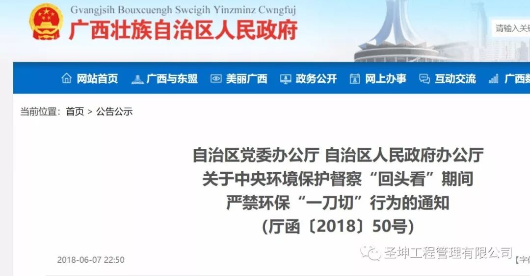 2018年6月7日广西发布关于中央环境保护督察“回头看”期间 严禁环保“一刀切”行为的通知 (厅函〔2018〕50号),明确提出: