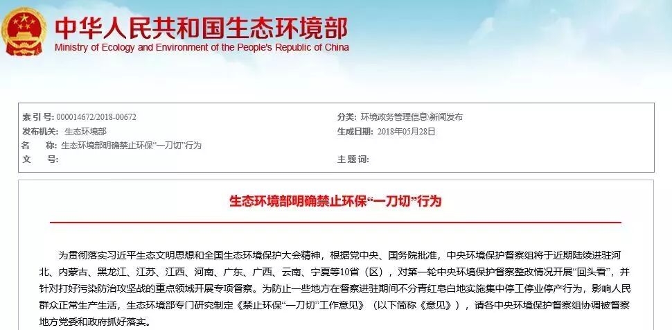 2018年6月3日河南省人民政府办公厅关于中央环境保护督察整改工作中坚决禁止“一刀切”的通知: