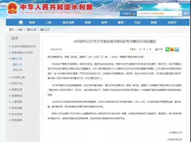 日前,水利部发布《关于开展全国河湖采砂专项整治行动的通知》,通知中指出为深入贯彻落实党的十九大精神和习近平总书记系列重要讲话精神,以及近期中央领导同志有关指示,进一步加强河湖采砂管理,严厉打击非法采砂行为,切实维护河湖健康生命,经研究,自2018年6月20日起,水利部在全国范围内组织开展为期6个月的河湖采砂专项整治行动。