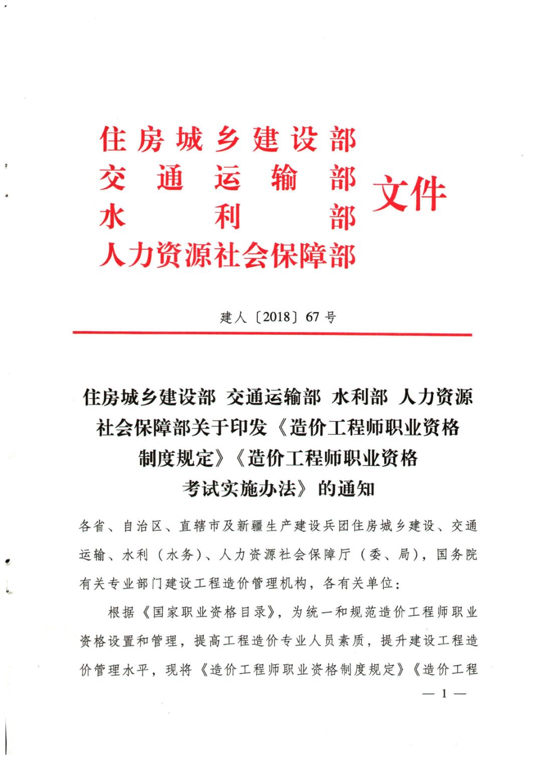 住房城乡建设部、交通运输部、水利部、人力资源社会保障部于7月31日印发《造价工程师职业资格制度规定》《造价工程师职业资格考试办法》的通知(建人〔2018〕67号)。