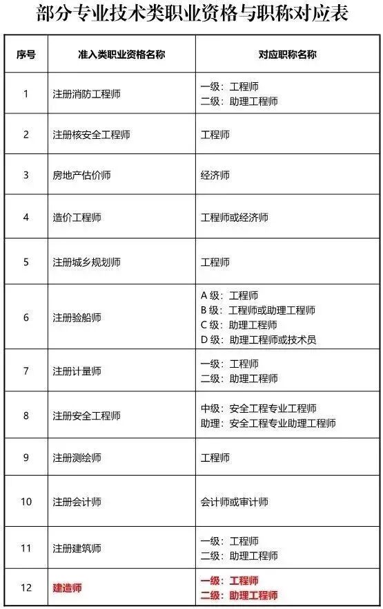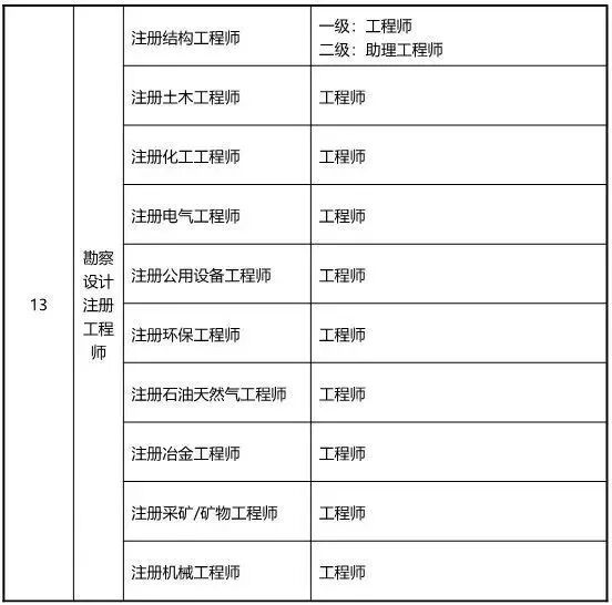 一、通过全国统一考试,取得注册消防工程师、注册核安全工程师、房地产估价师、造价工程师、注册城乡规划师、注册验船师、注册计量师、注册安全工程师、注册测绘师、注册会计师、注册建筑师、建造师、勘察设计注册工程师等13项准入类职业资格证书的专业技术人员,其职业资格直接对应相应系列和层级的职称(见附件),两者享有同等效力。