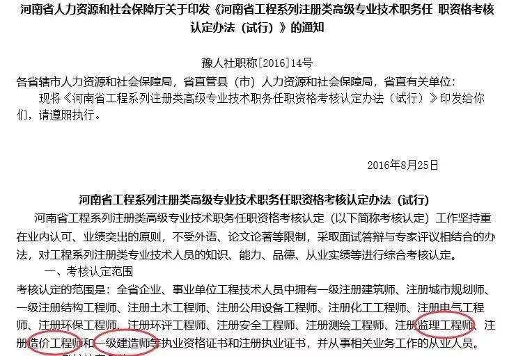 2016年,《河南省工程系列注册类高级专业技术职务任职资格考核认定办法(试行)》明确: