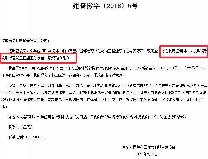 依据《中华人民共和国行政许可法》第六十九条、第七十九条和《建筑业企业资质管理规定》(住房城乡建设部令第22号)第二十九条、第三十六条,我部决定撤销你单位建筑工程施工总承包一级资质的行政许可,且你单位自撤销之日起3年内不得再次申请该项行政许可。请你单位在收到本决定书之日起15日内,持建筑工程施工总承包一级资质证书到河南省住房和城乡建设厅办理相关手续。