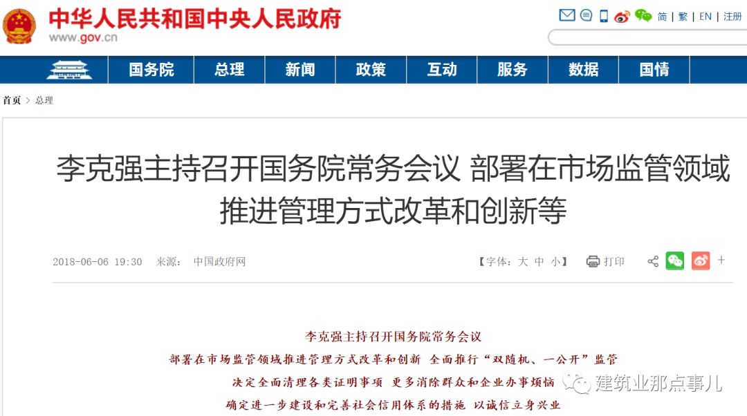 国务院总理李克强6月6日主持召开国务院常务会议,部署在市场监管领域推进管理方式改革和创新,全面推行“双随机、一公开”监管;决定全面清理各类证明事项,更多消除群众和企业办事烦恼;确定进一步建设和完善社会信用体系的措施,以诚信立身兴业。
