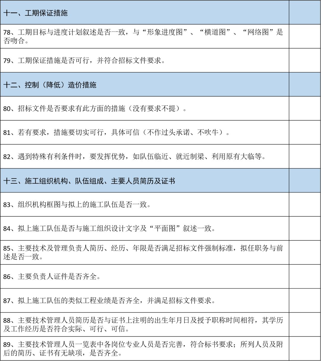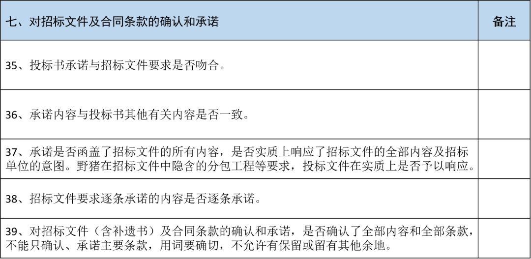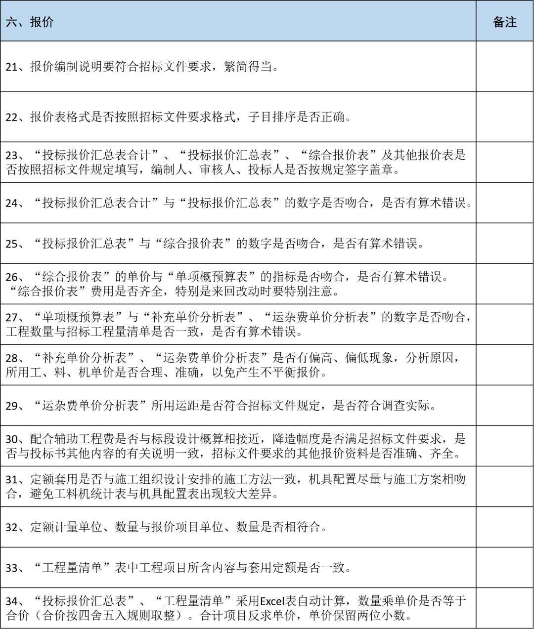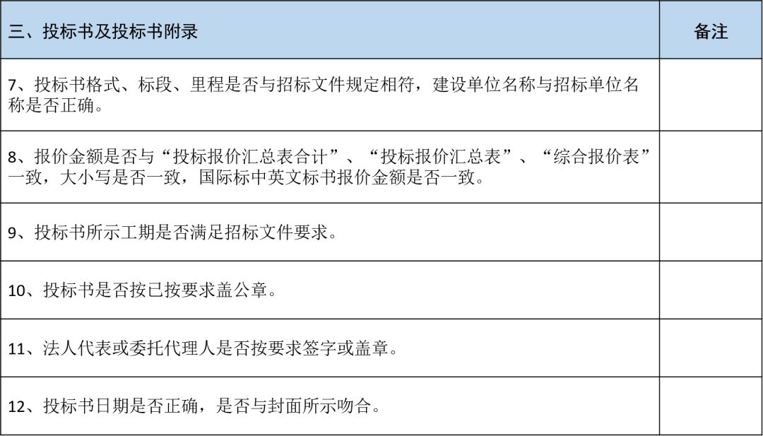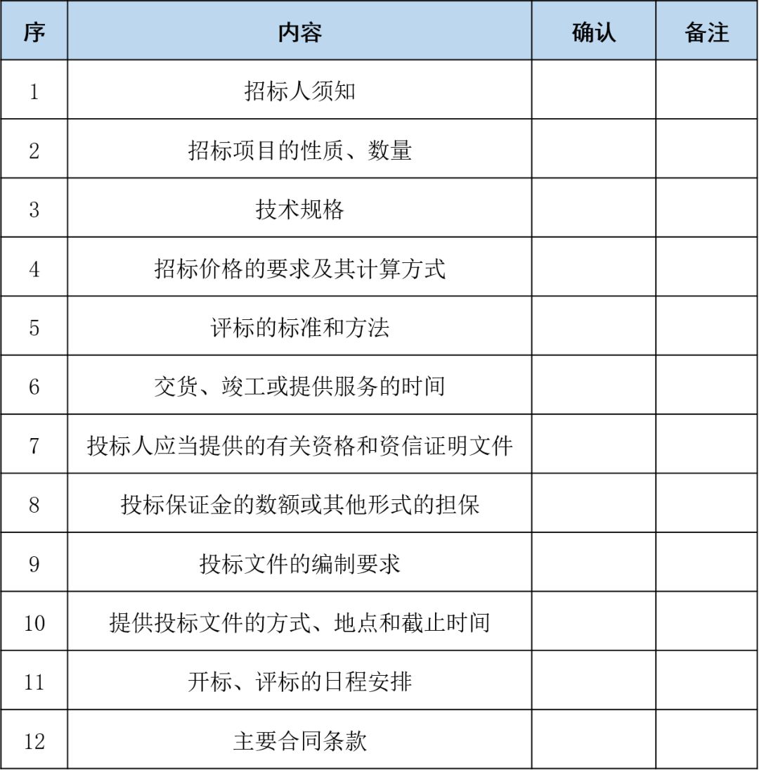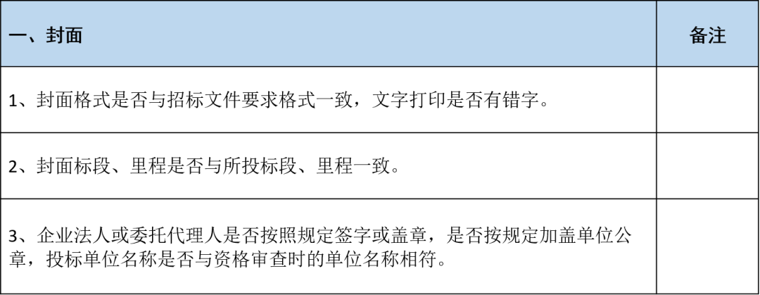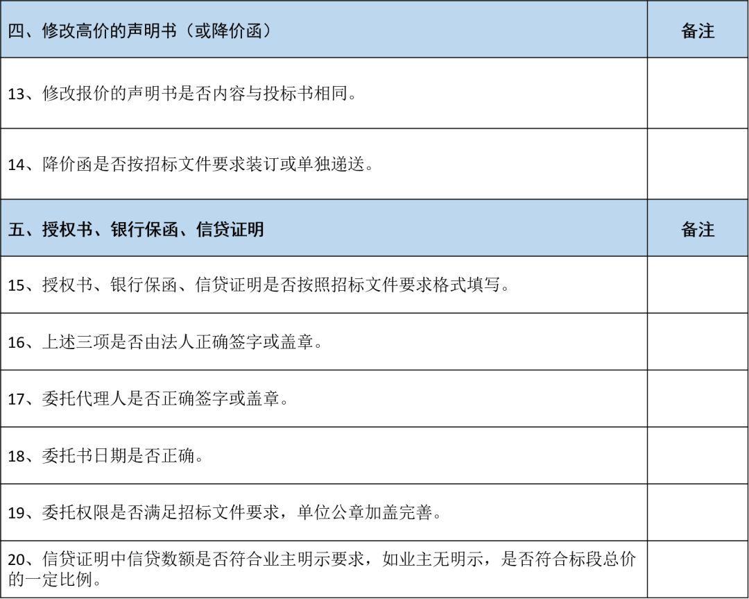 投标文件包含的内容很多,如果整理杂乱无章,文件整理不全,很可能让辛苦制作的标书成为废标。下表整理出检查投标文件的关键点,建议投标前对照下表进行核查。
