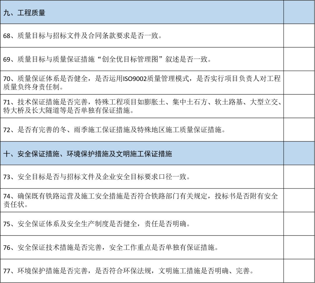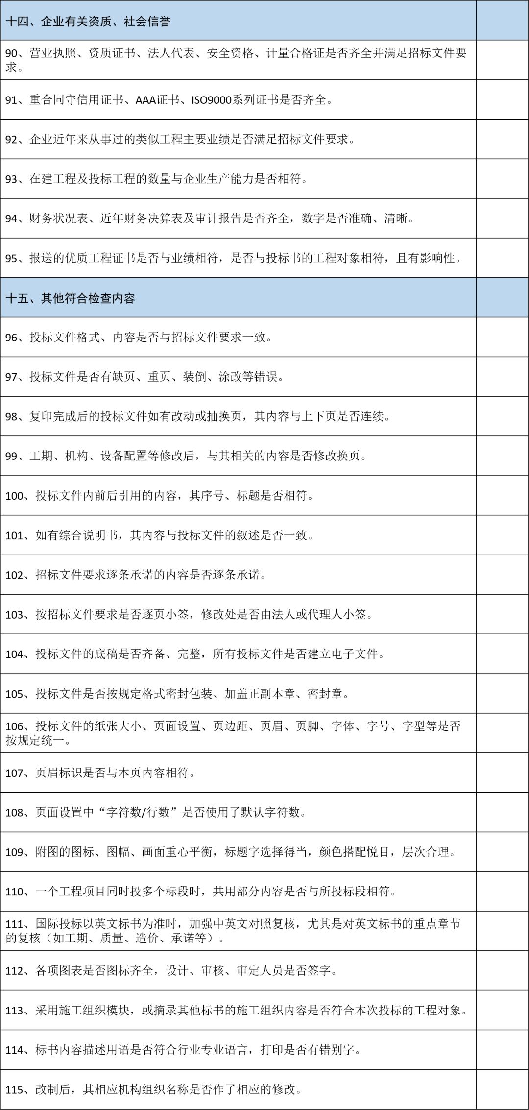 下面这一套核查表格,涵盖了投标文件容易出错的115处“雷区”,投标文件编制好后按此表格进行核查,能够避免废标的产生。