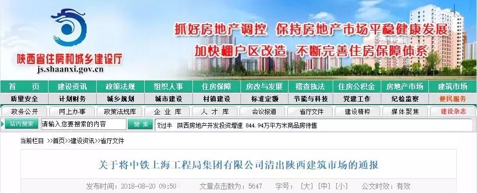 8月20日,陕西省住房和城乡建设厅发布《关于将中铁上海工程局集团有限公司清出陕西建筑市场的通报》:
